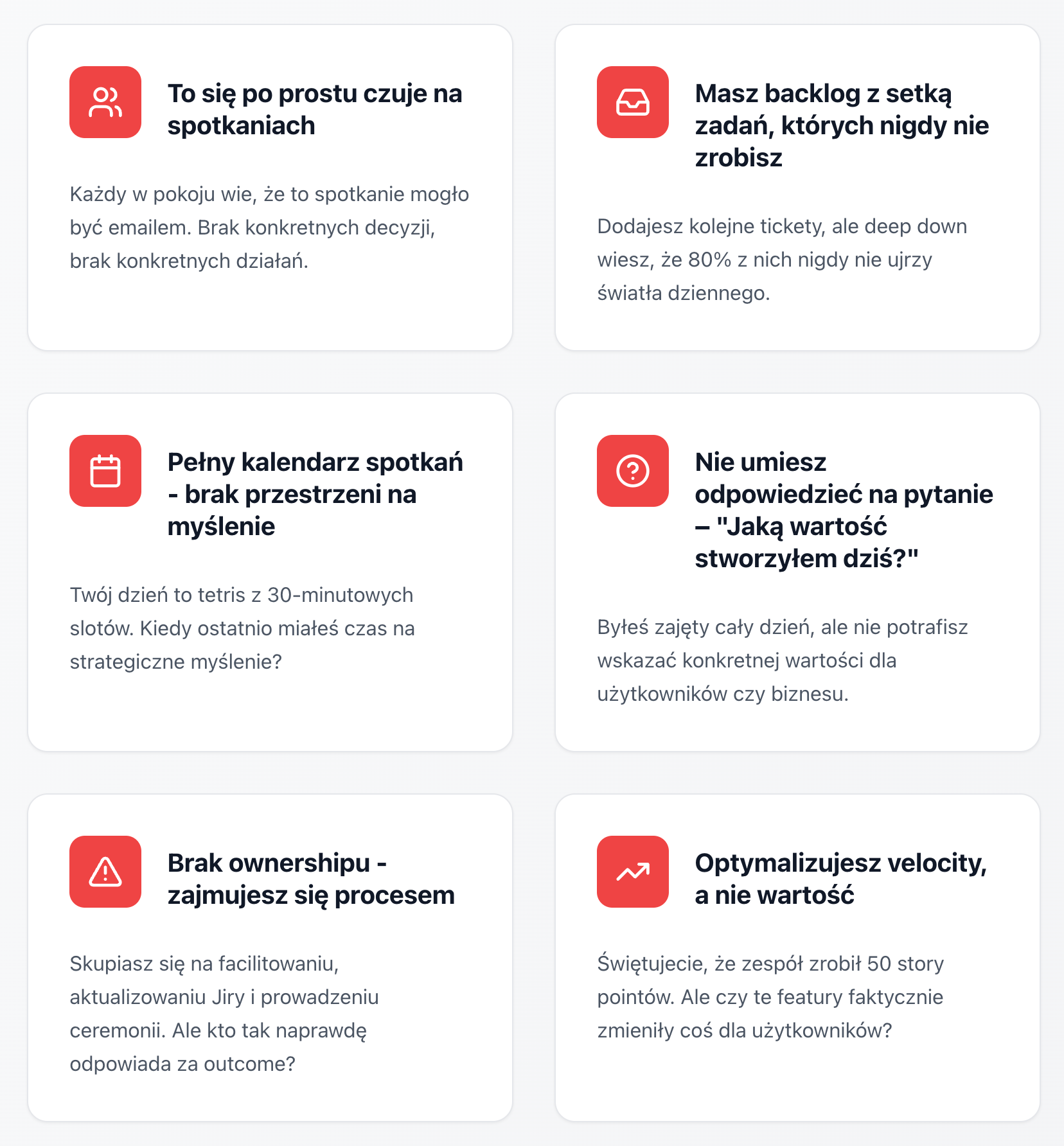 Poniżej znajdziesz 6 sygnałów ostrzegawczych, które pomogą Ci rozpoznać bullshit PM u siebie. Przeczytaj każdy punkt i szczerze odpowiedz sobie na pytanie: "Czy to ja?".
