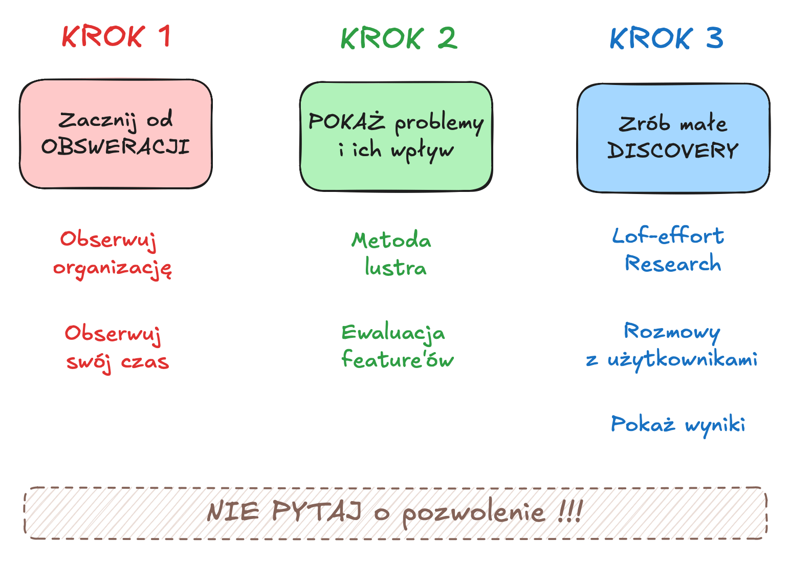 Prosząc o pozwolenie, pozycjonujesz discovery jako "ekstra pracę". Gdy mówisz: "Czy mogę zrobić discovery?", organizacja słyszy: "Czy mogę wydłużyć timeline?". Gdy po prostu to robisz i pokazujesz wyniki, organizacja widzi wartość, nie koszt.